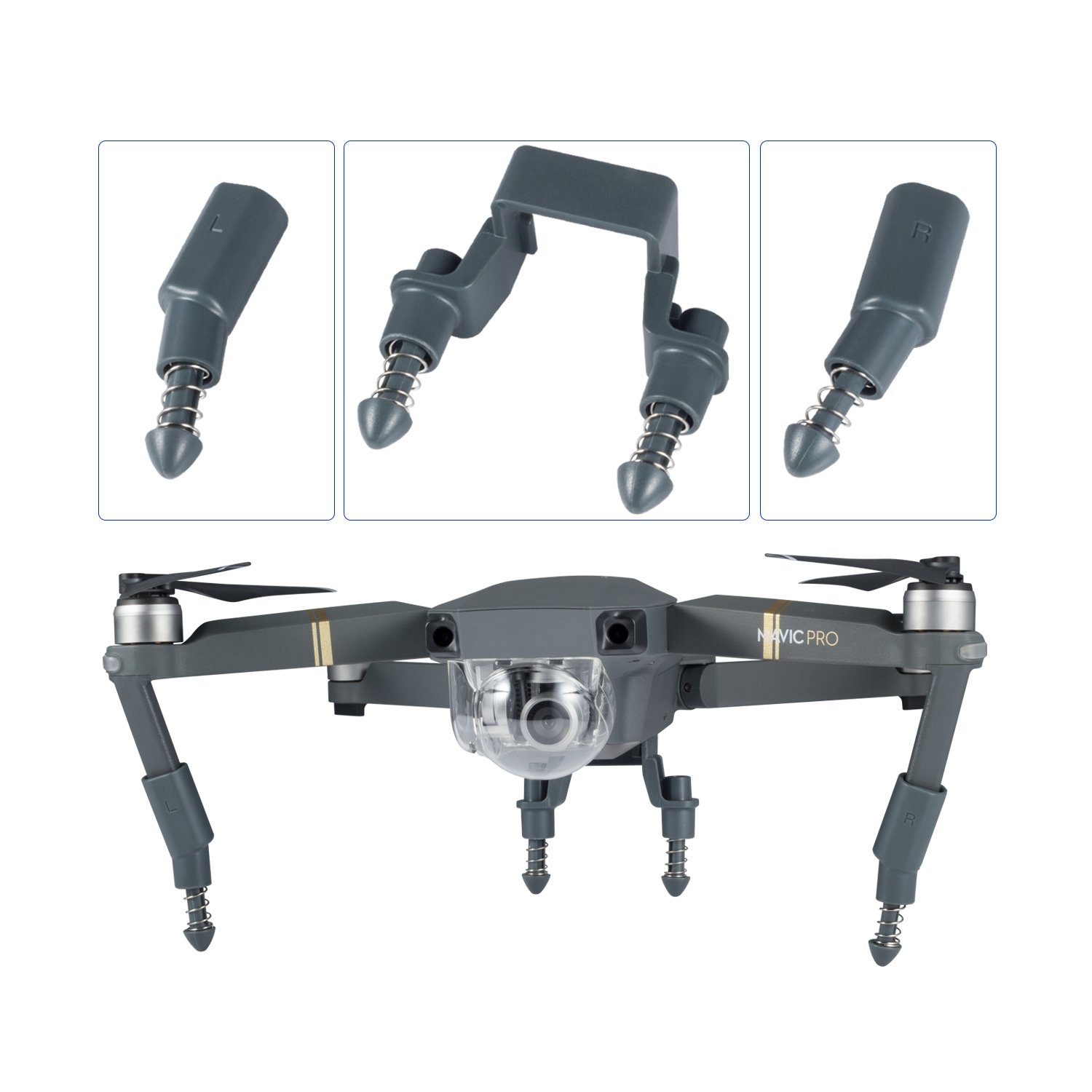Due delle estensioni sono per le "gambe" anteriori. Piazzati di fronte alla telecamera del Mavic e monta l'estensione contrassegnata con la "L" a sinistra; e quindi installa quella contrassegnata con la "R" a destra.